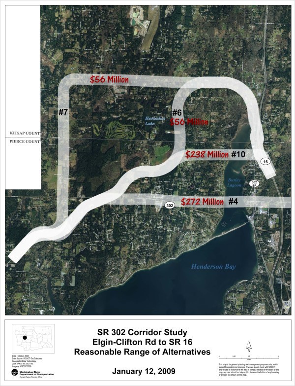 Two of the four remaining alternatives to be submitted into the EIS process include constructing expensive bridges across Burley Lagoon. Two alternative routes circumnavigate the lagoon and meet commuter needs at far lower costs. Public comments must be received by WSDOT between Jan. 2, 2009 and Feb. 13, 2009 to be included in the NEPA/SEPA scoping report.